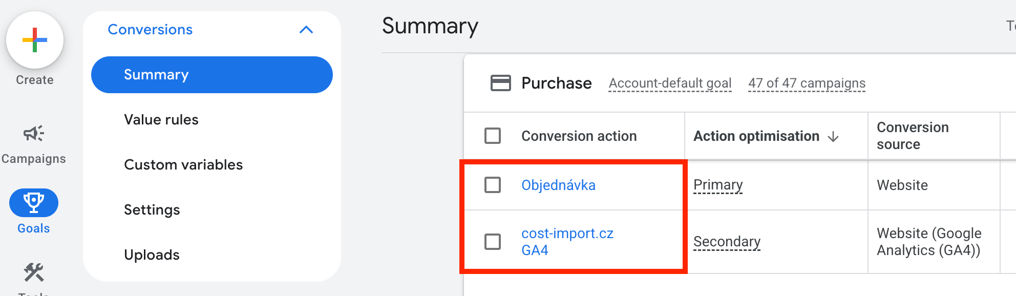 Je možné stahovat jen vybrané Conversion action. Jejich přesný název se odděluje čárkou.