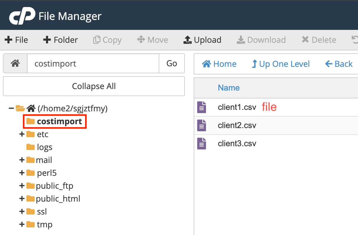 Nahrané CSV soubory na SFTP serveru si můžete zkontrolovat přes File Manager: Hosting » File Manager