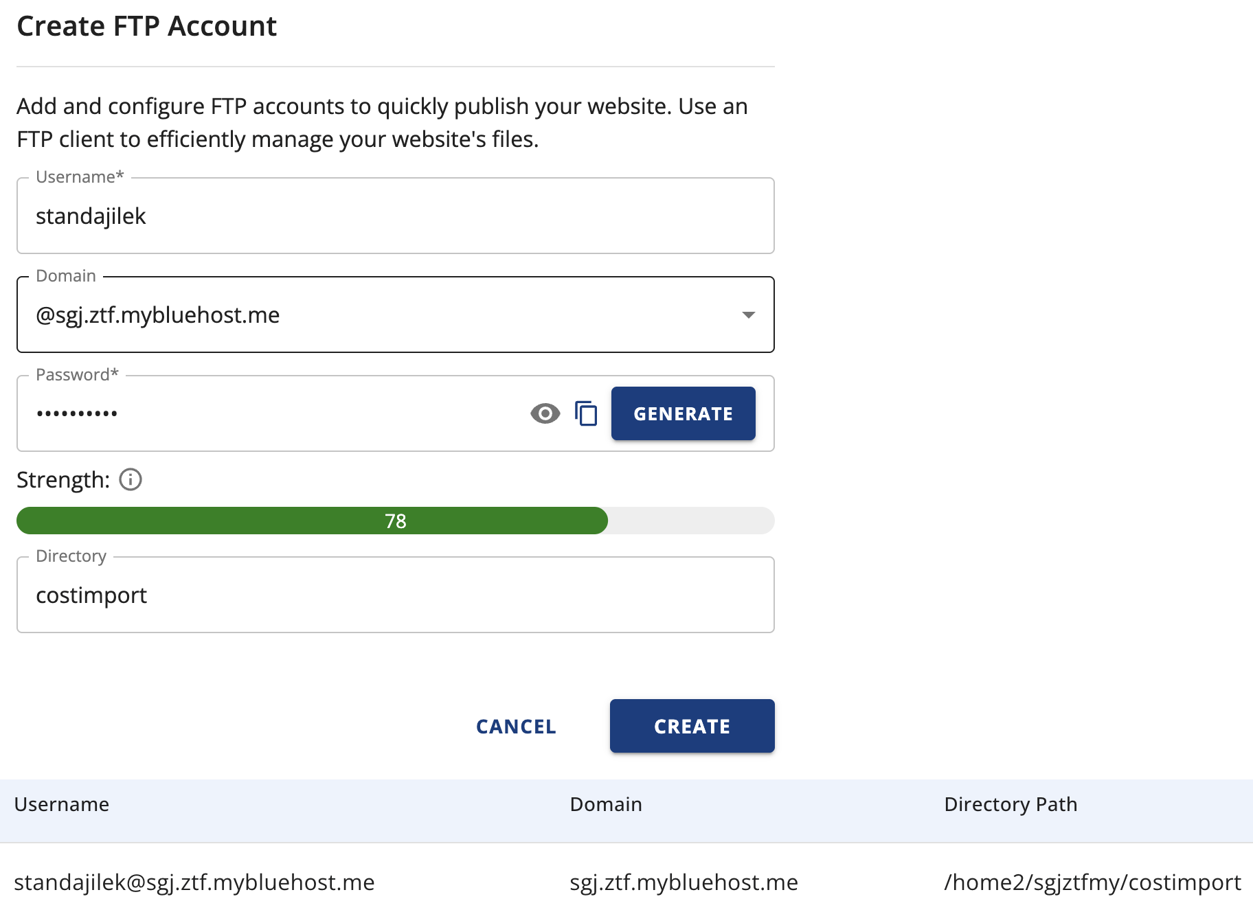 Zde je potřebné vytvořit FTP účet (Create FTP account). Username i Password mohou být libovolné. Directory může být rovněž libovolné, například costimport. Po vytvoření FTP účtu se objeví Username a Domain (Host), které se zadávají v config spreadsheetu do listu ftp_connection.